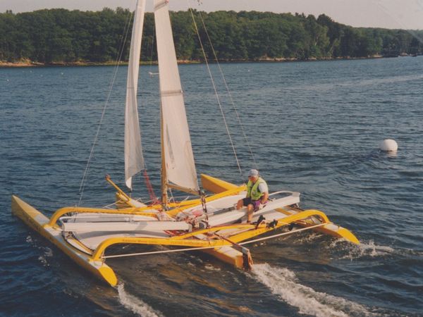 It occurred to me that I should builld a one-man sailboat that could take advantage of this steady sea breeze. I looked around for the right design, and came across a fifteen-foot trimaran with a windsurfer sail rig that could potentially sail at more than twenty knots. That I knew, was the boat for me.